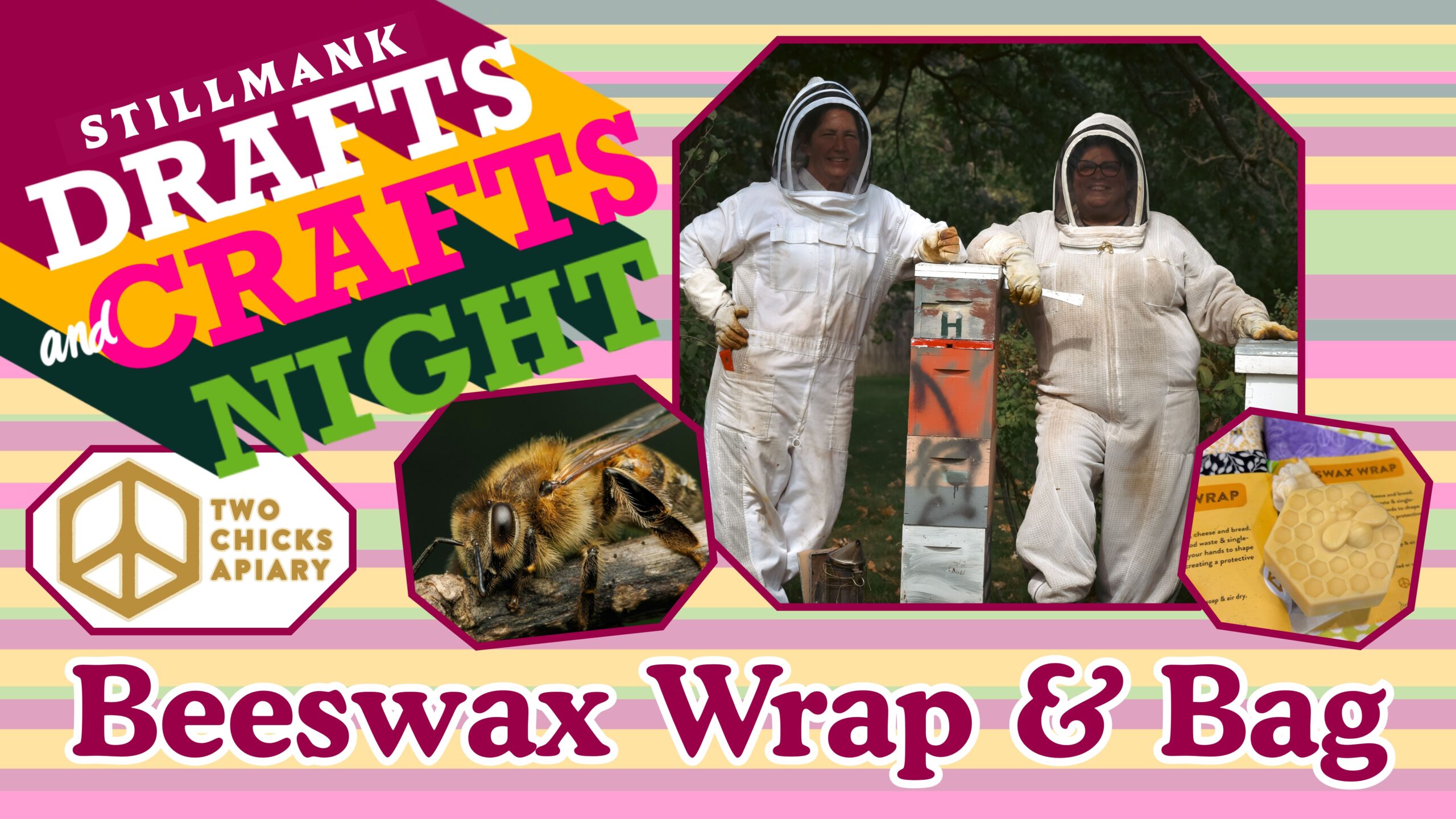 Join local beekeepers from Two Chicks Apiary as they teach you how to make reusable sustainable beeswax wraps and bags using wax from their hives. Discover some cool facts about honeybees including how they produce wax and why it is so special. Each participant will create and take home an eco-friendly beeswax wrap or bagYour Beeswax Wrap and Bag Class ticket ($41) also includes a pint of Stillmank cider, beer or seltzer or a pour of Honeymood mead and sample product from Two Chicks Apiary.